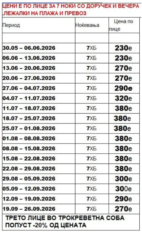 ЦЕНАТА Е ЗА 7 ХБ(ПОЈАДОК  И ВЕЧЕРА )СО ЛЕЖАЛКИ НА ПЛАЖА ВКЛУЧЕН ПРЕВОЗ